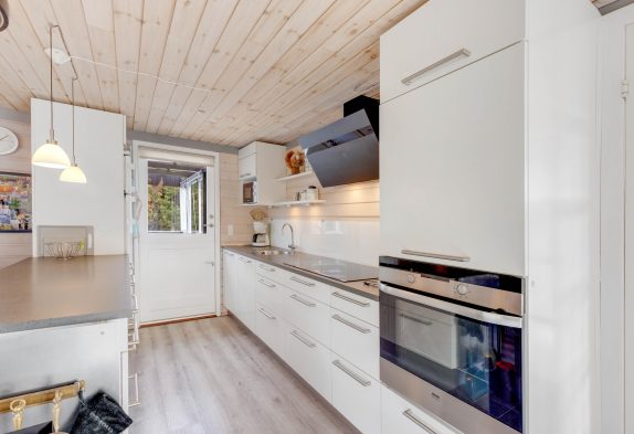 Feriestemningen er perfekt i dette feriehus med det typiske åbne køkken, en hyggespredende brændeovn og en dejlig stor hjørnesofa med plads til hele familien. Køkkenet er veludstyret og med opvaskemaskine, så der er god tid til andre familieaktiviteter. Tag fx en aftentur ved stranden med hunden og nyd efterfølgende en øl eller et krus varm kakao og et spil kort foran den knitrende brændeovn.