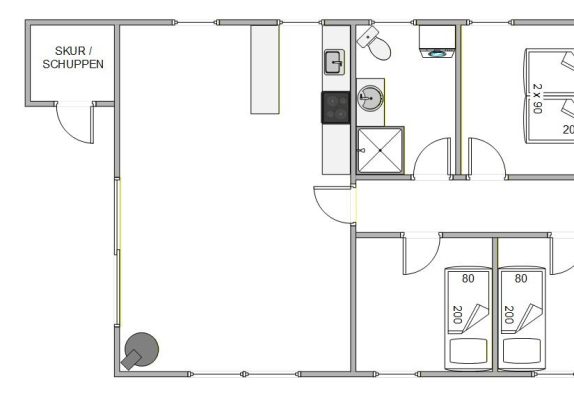 Opholdsrummet med stue og køkkenafdeling er sommerhusets samlingspunkt. Køkkenafdeling har hvad der er brug for, bl.a. mirkoovn og opvaskemaskine. Fra den åbne køkkenafdeling kan du sagtens følge med i livet i stuen, selvom du står for madlavningen.