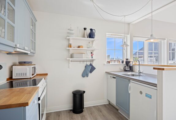 Kan I godt lide at sove med åbne vinduer, så er det godt havet kun er en enkel klitrække væk og lyden fra havets bølger kan hjælpe jer med at falde i søvn. Den veludstyrede lejlighed byder tilmed på en opvaskemaskine, vaskemaskine og tørretumbler, så hverdagens praktiske gøremål også kan gøres under ferien, og I ikke kommer hjem med rent beskidt tøj.