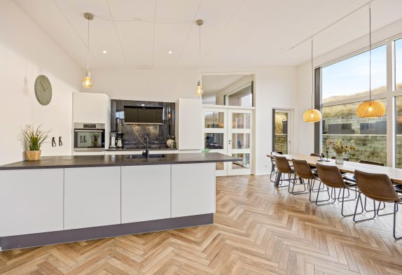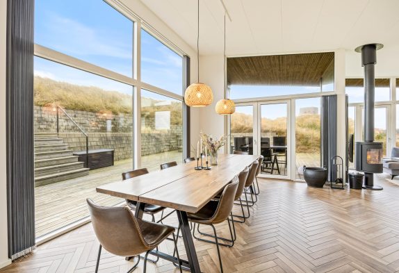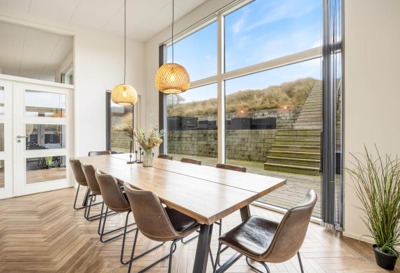 Moderne, stilfuldt og indbydende er tre ord, der meget præcist indfanger omgivelserne på Klitdalen 35. Sommerhuset er opført i 2020, og de 130 kvadratmeter er virkelig lækkert indrettet i lyse farver, med masser af vinduer og flot interiør. Det er nemt at se, at der er lagt stor vægt på, at I skal føle jer godt tilpas på jeres nye ferieadresse.