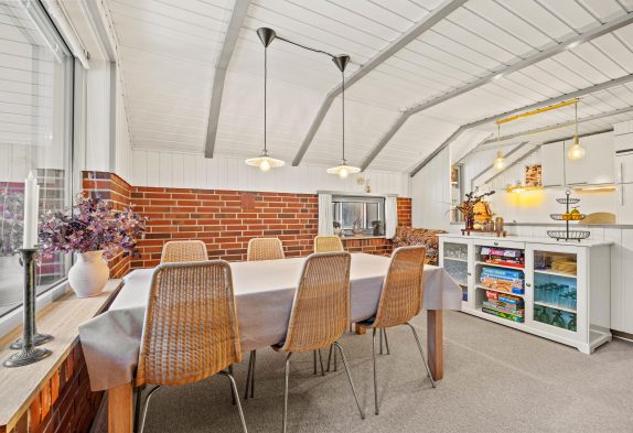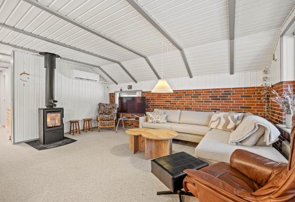 Opholdsrummet fungerer som sommerhusets hjerte og feriens mødested. Her kan I samle hele flokken til hyggelige feriestunder med god mad, brætspil og afslapning på sofaen. Brændeovnen sørger for god stemning og dejlig varme hele året rundt. En energibesparende varmepumpe er også tilgængelig til opvarmning.