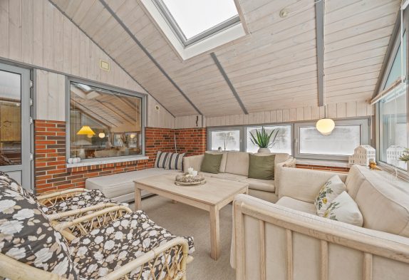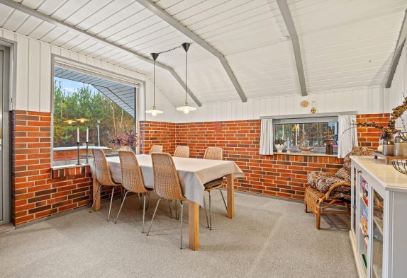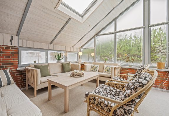 Fra stuen kommer I ind i et af feriehusets highlights, udestuen. Gennem de store vinduer har I frit udsyn til Houstrups grønne natur, og der findes næppe noget mere afslappende end at nyde en varm kop kaffe, mens regnen trommer på ruderne.