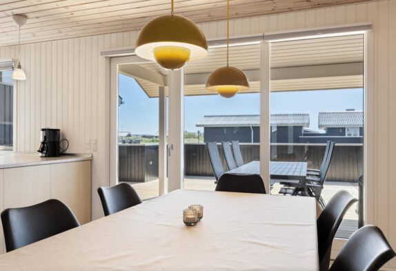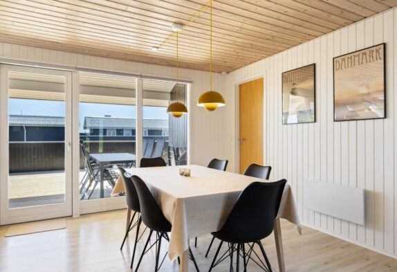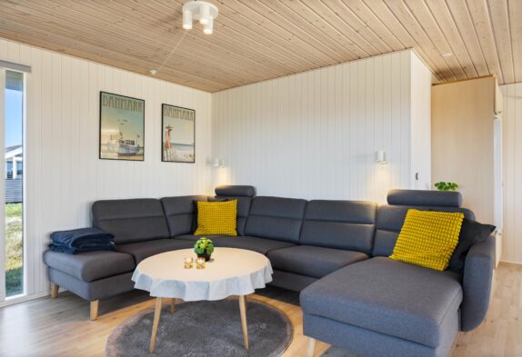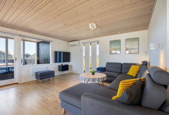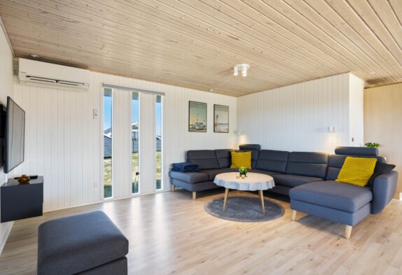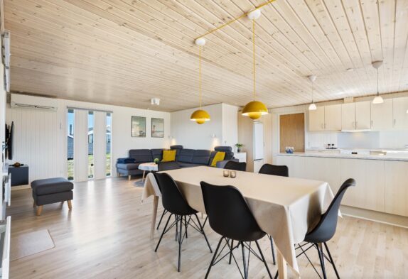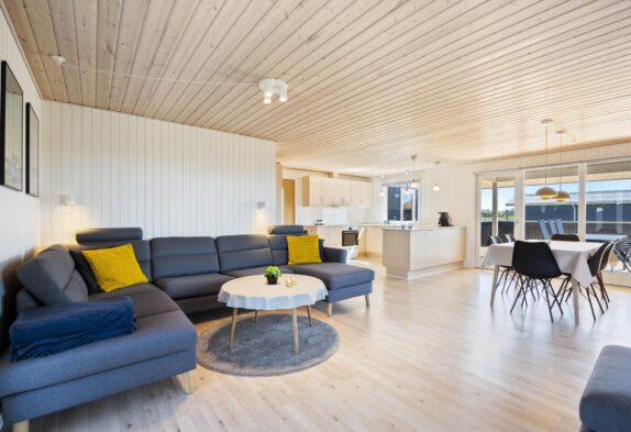 Opholdsrummet har også en god, stor spiseplads og en hyggelig stor sofa, hvor I kan hygge inden døre med 55” Smart TV med chromecast. Vil I høre musik, kan I benytte bluetooth-enheden i feriehuset – måske imens I dyster i diverse familiespil.