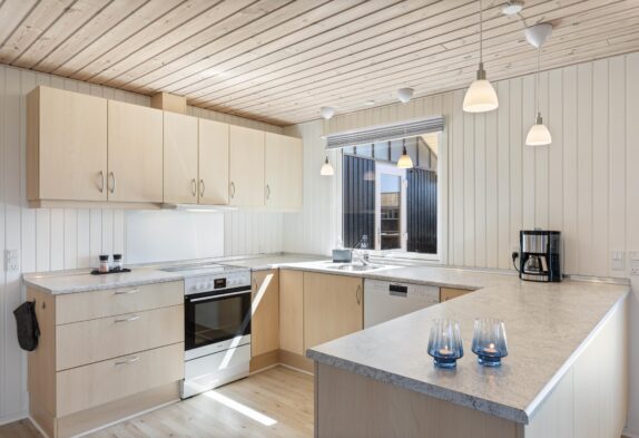 Sommerhusets centrum er det store kombinerede stue- og opholdsrum, hvor I bl.a. finder den veludstyrede køkkenafdeling med masser af bord- og skabsplads, 120 l. fryser, mikroovn og opvaskemaskine, hvilket gør husarbejdet til en leg.