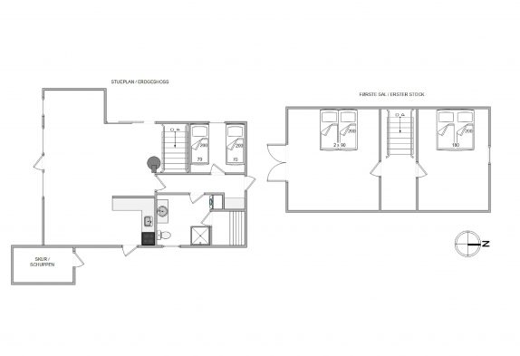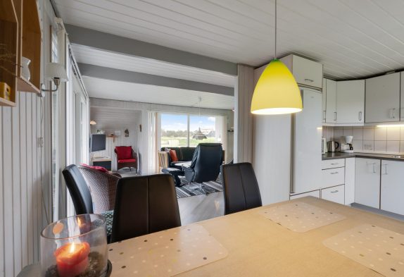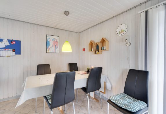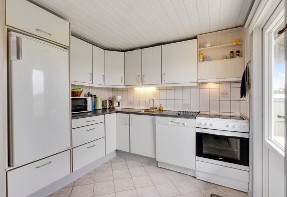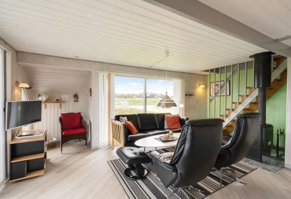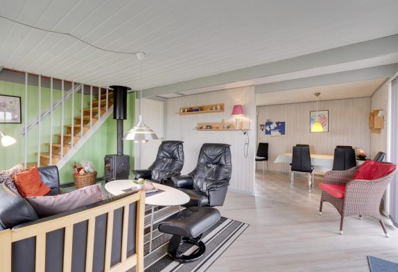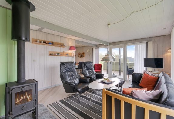 Sommerhusets badeværelse er udstyret med gulvvarme, og herfra er der også adgang til saunaen, som giver jer mulighed for svede hverdagens stress ud på ferien. Brændeovnen i stuen sørger for god, klassisk feriestemning.