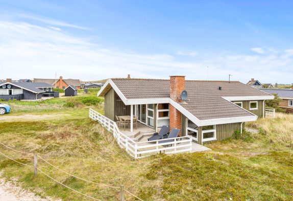 Kun 100 meter fra stranden og lige bag den yderste klitrække finder I dette hyggelige træferiehus, beliggende på Julianevej 188, midt i det populære feriehusområde Bjerregård. Sommerhuset er med sauna og er indrettet til 5 personer – velegnet til en skøn familieferie. På sommerhusgrunden finder I desuden et el-ladestik til elbiler.