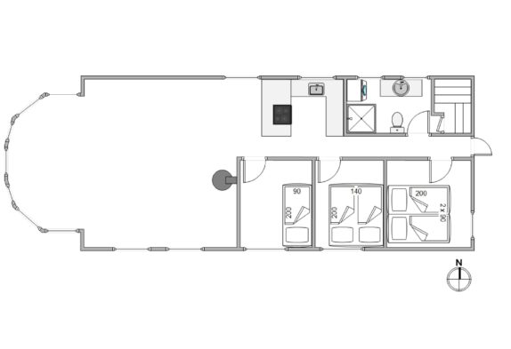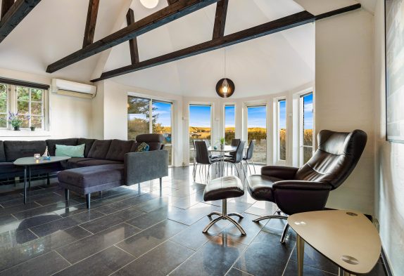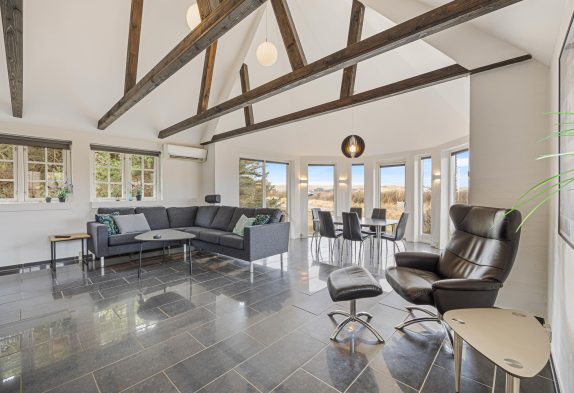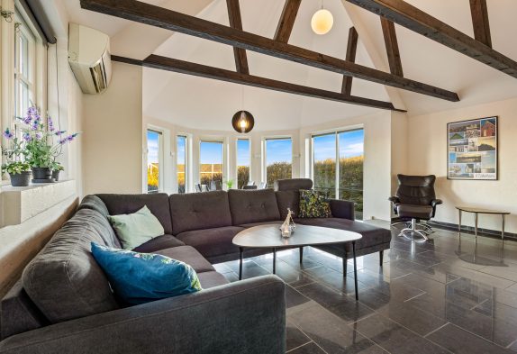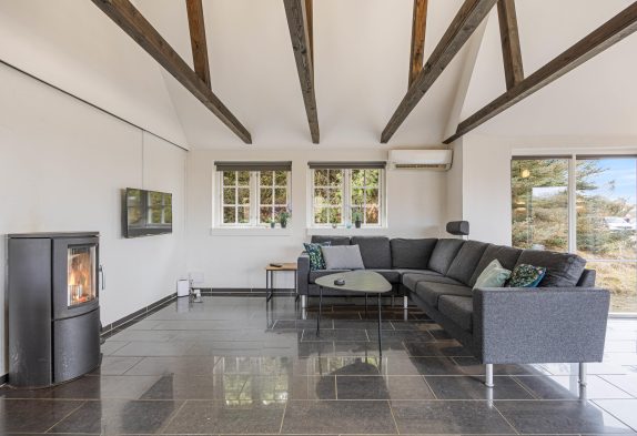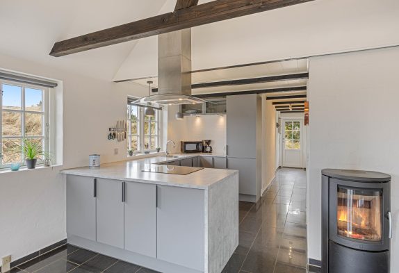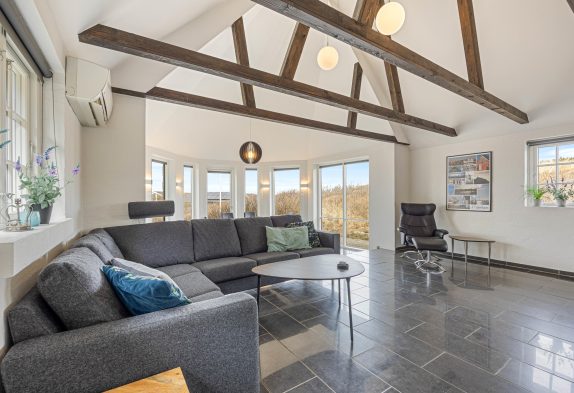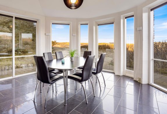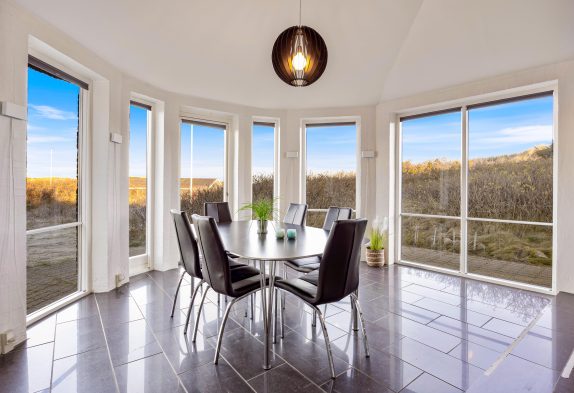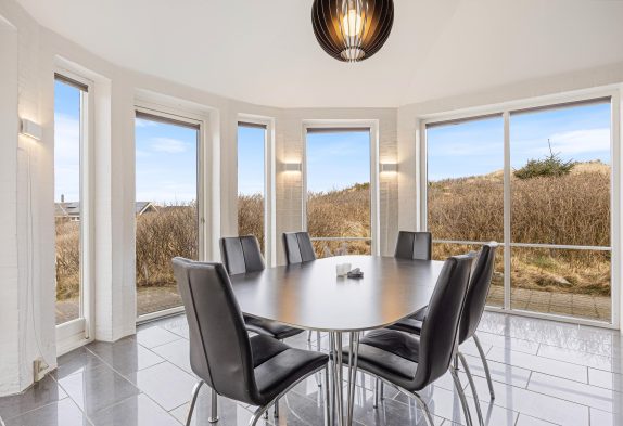 Feriehuset, som er renoveret i 2020, er godt indrettet – bl.a. med spiseplads i den flotte kanap med de store vinduer, som tager sollyset og naturen med helt ind i stuen. Her kan I også om aftenen nyde solnedgangen over klitterne, og derefter stjernehimlen, hvis vejret ikke er til at sidde udenfor.