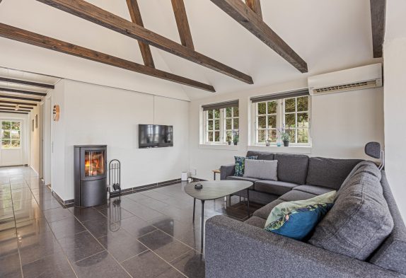 Der er naturligvis gulvvarme i badeværelset og i opholdsrummet, hvor der overalt er flotte flisegulve. I soveværelserne er gulvene med trælaminat. For at holde energiforbruget nede, finder I også en varmepumpe i feriehuset.