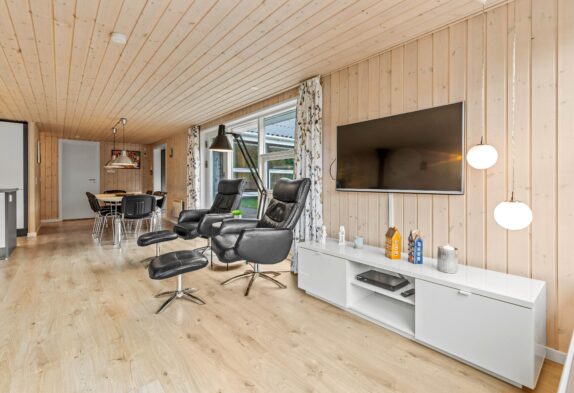 Dette skønne sommerhus i Vejers Strand er et oplagt valg til den næste familieferie. Her er plads til 8 personer og 3 hunde – så ingen familiemedlemmer behøver at blive hjemme. Den indbydende indretning har noget for enhver smag, både et aktivitetsrum og et luksuriøst wellnessbadeværelse. Prikken over i’et er det fantastiske udeareal med lukket terrasse, legeplads og en stor og velholdt græsplæne.