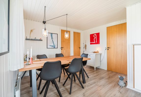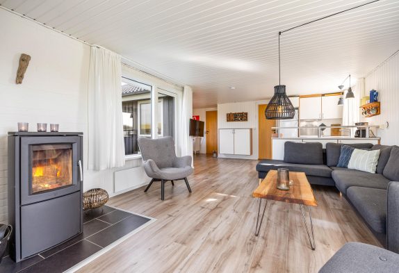 Husets hjerte er det lyse køkkenalrum. Det åbne samtalekøkken og den centralplacerede brændeovn skaber masser af hygge og plads til nærvær, også når man står i køkkenet og forbereder aftensmaden. Heldigvis er der en vaskemaskine, så der er ekstra tid til at være sammen med familien. Det store spisebord står klar til mange hyggelige brætspilsaftener, eller hvis I er mere til en hyggelig filmaften, kan I også gøre dette sommerhusets stue. Det er også i sommerhusets stue, hvor I kan finde den dejlige brændeovn. Brændeovnen er altid garant for sprede en masse hygge og varme, hvilket er med til at skabe den perfekte feriestemning.