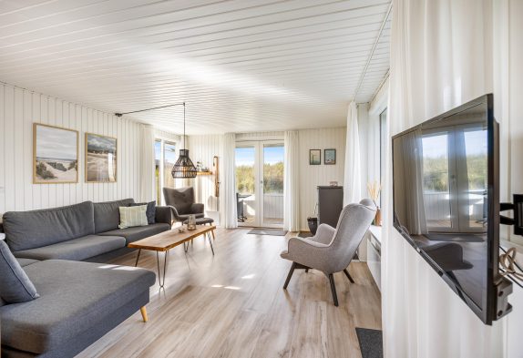 En stor træterrasse kredser rundt om hele huset. Her er derfor altid er sted i læ at finde. En del af terrassen er overdækket og afskærmet, så man på de dage med mindre godt vejr også kan nyde den friske havluft udenfor, med en kop morgenkaffe i hånden. Terrassen er udstyret med diverse havemøbler og en grill, så I kan grille og hygge hele dagen.Fra huset er der også en sti, som vil føre jer direkte til havet, der er et syn for sig selv uanset om det er midt i Juli, eller om det i december.
