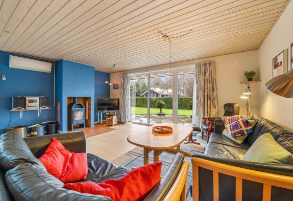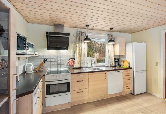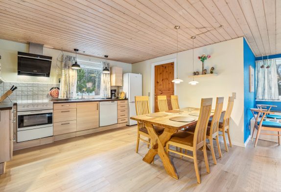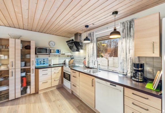 Køkkenet er udstyret med en opvaskemaskine, der gør madlavningen og oprydningen til en fornøjelse, mens den tilstødende stue inviterer til brætspil og hyggestunder. Her finder I også en brændeovn, der tilføjer den klassiske sommerhusstemning.