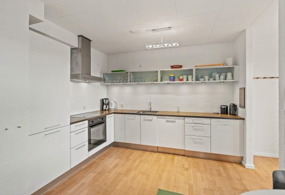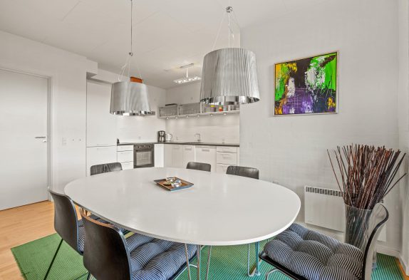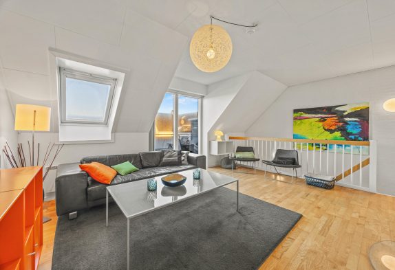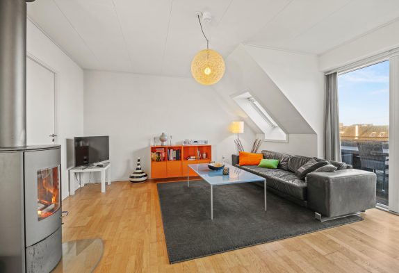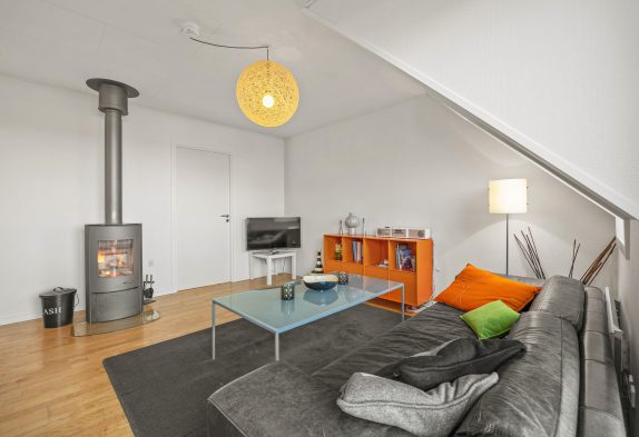 På første sal finder du en hyggelig og smagfuldt indrettet stue med brændeovn. Herfra er der udgang til en vestvendt balkon, som især er skøn at opholde sig på om aftenen, hvor du kan få fuld glæde af dagens sidste solskinstimer, mens du nyder den skønne udsigt over området, måske med et godt glas vin i hånden.