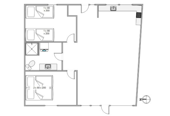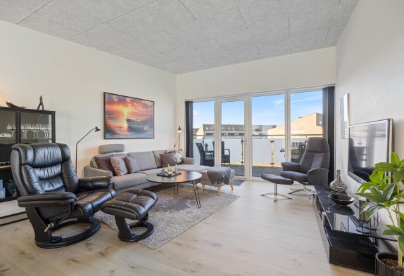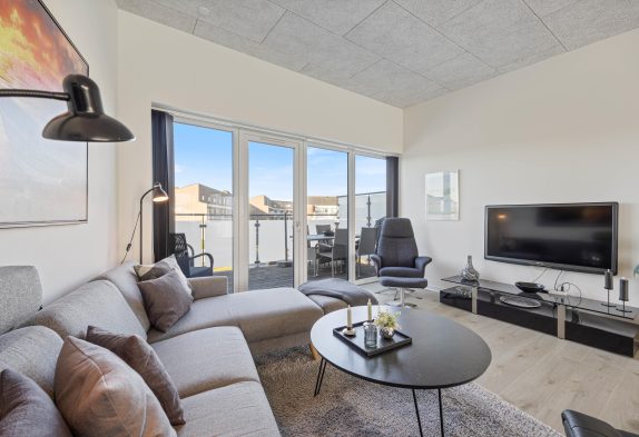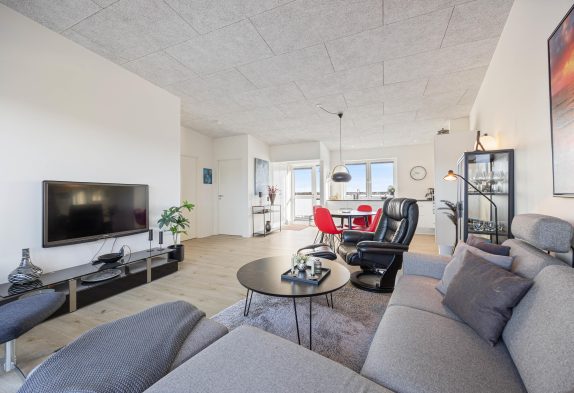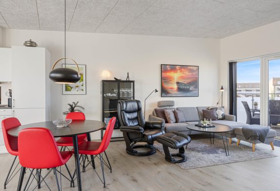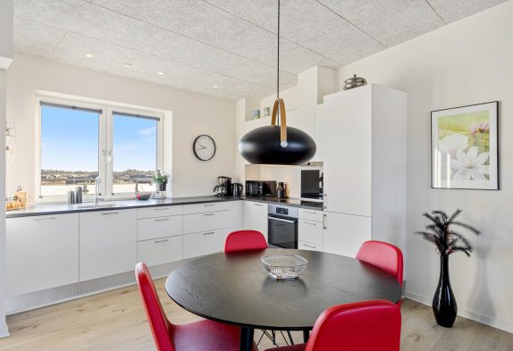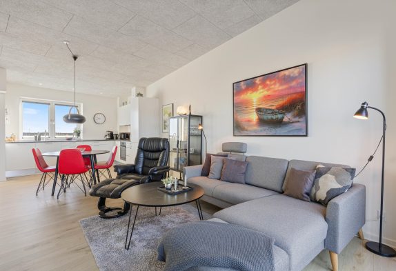 Lejligheden har en åben indretning, hvor der er højt til loftet. Det store vinduesparti mod nordvest sørger for naturligt dagslys i opholdsrummet om dagen. Køkkenet er veludstyret og står klar til, at feriekokken iblandt jer kan slå sig løs. Her er god skabsplads og både en opvaskemaskine, mikrobølgeovn, en separat frysedel på 80 liter i køleskabet, og en induktionskogeplade med ovn.