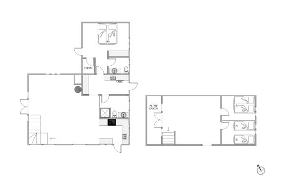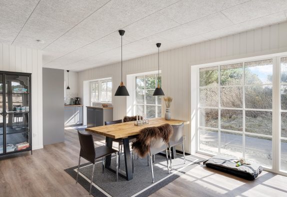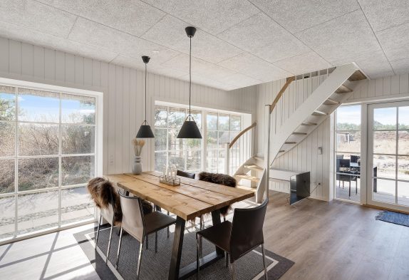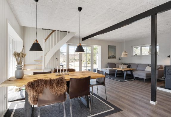 Imens syvsoverne nyder ferieroen på første sal, kan dagen begynde i stueetagen, hvor både køkken og bad samt et stort soverum befinder sig. Det store fællesrum med åbent køkken og opholdsstue med brændeovnen er det oplagte samlingssted for familiehyggetid.