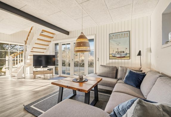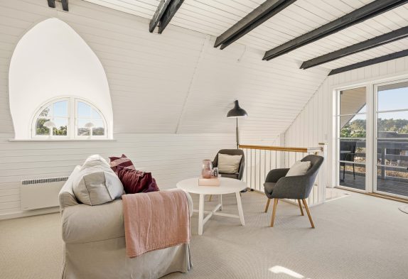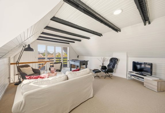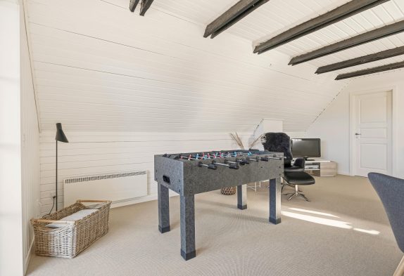 Familien kan fordele sig på to etager. På første sal ligger to soverum og et opholdsrum med tv og bordfodbold– samt en dejlig sydvendt balkon med udsigt over området.
