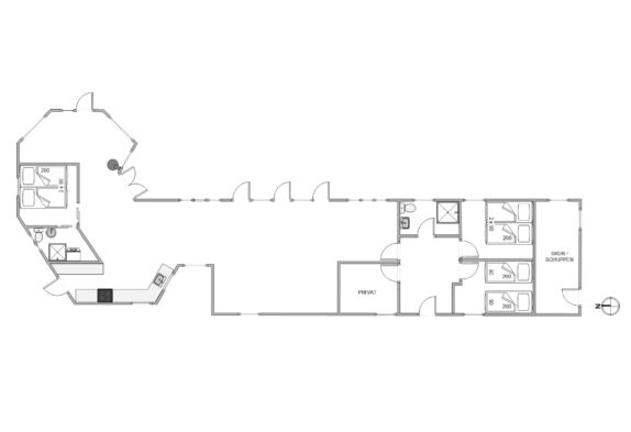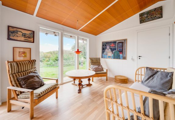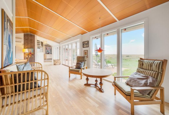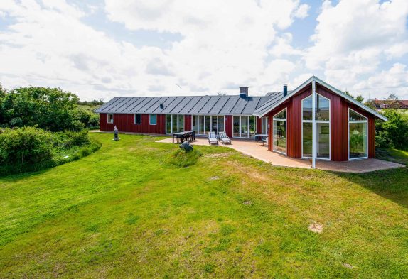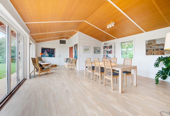 Det røde sommerhus overrasker med den gennemtænkte ruminddeling og åbne konstruktion. Dette gør, at der fra både stue, køkken og spisestue er en fantastisk udsigt over det åbne landskab og fjorden. Den tidlige morgensol strømmer ind ad den store vinduesfront og uanset hvor du befinder dig ånder det af fred og ro mod øst.