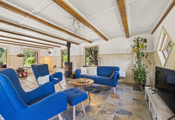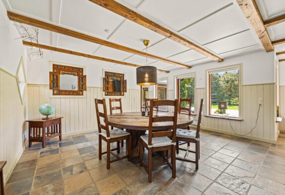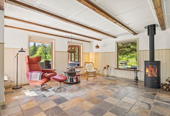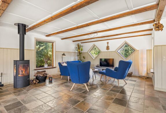 Midt i huset finder du et hyggeligt køkken med adgang til terrassen og med kig til stuen, som rummer et stort rundt spisebord, sofahyggekrog med Smart TV samt bibliotekshjørne med brændeovn, hvor du kan nyde en bog, den knitrende ild og udsigten over den store naturgrund.