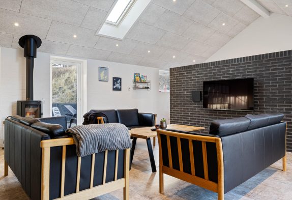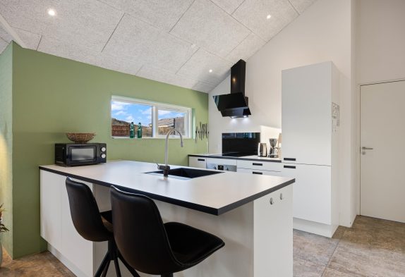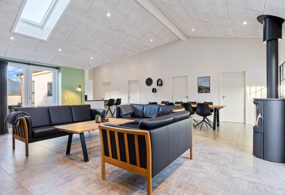 Den i 2020 tilbyggede længe til huset rummer det store og lyse opholdsrum. Det åbne samtalekøkken er veludstyret og står klar til, at feriekokken kan slå sig løs. Opvasken klares naturligvis af opvaskemaskinen. I åben forbindelse til køkkenet finder I spise- og stueområdet med lækker brændeovn. De store ovenlysvinduer sørger for masser af naturligt dagslys og gennem terrassedørene kommer I ud på husets brolagte og afskærmede terrasse med egen grill.
