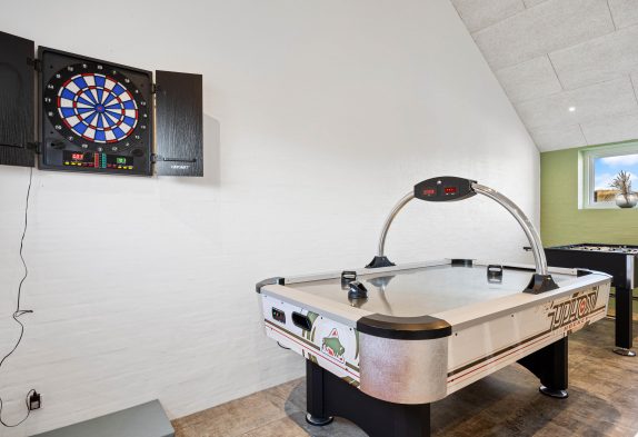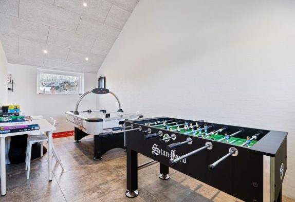 Skillevæggen i stuen sætter den i åben forbindelse til aktivitetsafdelingen af huset. Her er der plads til, at børn og barnlige sjæle kan lege og spille mod hinanden i dart, bordfodbold og airhockey.