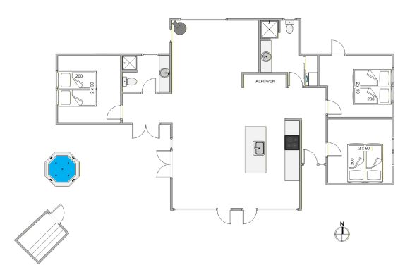 Huset rummer i alt 3 soveværelser. De to badeværelser, begge udstyret med gulvvarme, er især praktiske, når I skal 6 mand afsted i sommerhus. Så er der mindre chance for kø om morgenen.