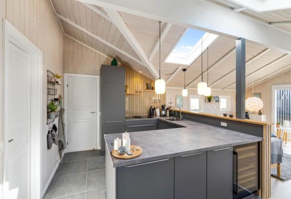Det flotte køkken er veludrustet med bl.a. mikroovn og opvaskemaskine. Midt i køkkenalrummet giver ovenlysvinduerne et virkeligt flot lysindfald. Derudover råder huset over både vaskemaskine, tørretumbler og energisparende varmepumpe.