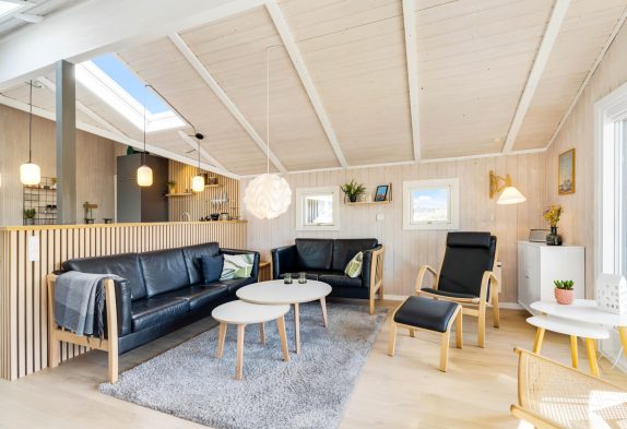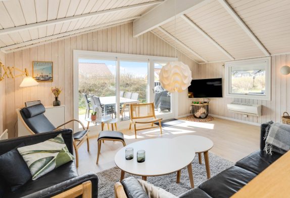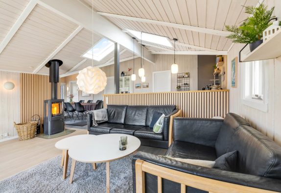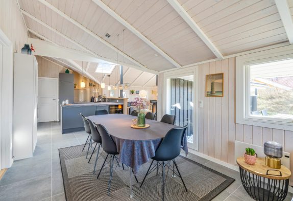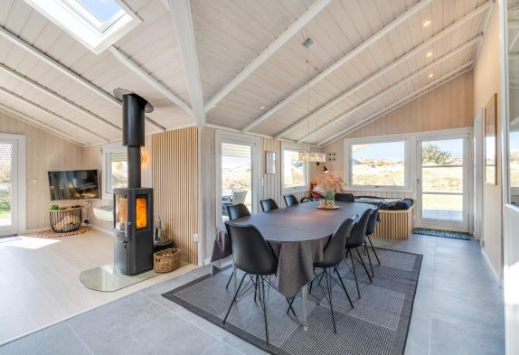 Fra det åbne køkkenområde er der et godt overblik over både stuen med brændeovn og flad-skærm, til spiseafdelingen med det store langbord. En lækker detalje, er det hyggelige hjørne for enden af spisebordet, her er der plads til rigtig at slappe af med en god bog efter en lang gåtur på stranden.