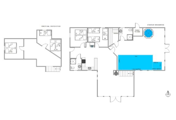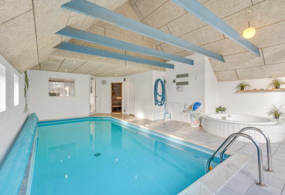 Sommerhusets kerne er en stor opholdsstue, som er forbundet med både køkken og spiseplads. Fra stuen er der direkte adgang til sommerhusets store poolafdeling, som består af en 18 m2 swimmingpool, en stor sauna, et spabad til 6 personer samt et dejligt badeværelse med bruser og toilet.