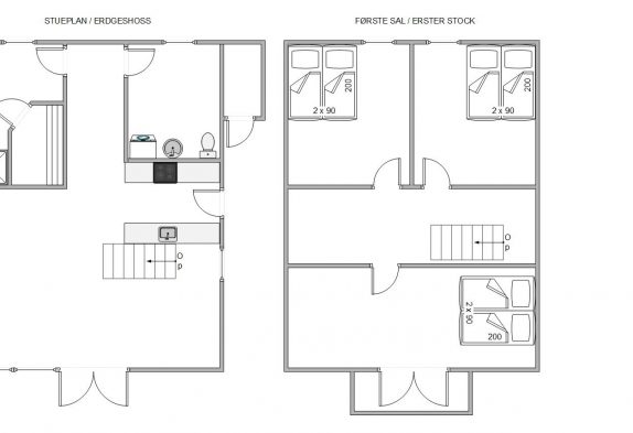 De 6 sovepladser fordeler sig i 3 gode soveværelser med dobbeltseng på første sal, hvor I alle vågner op til den smukke udsigt – enten over hede-landskabet mod syd – eller til viewet over sommerhusområdet mod nord.