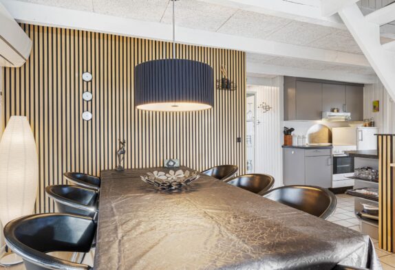 Der er god plads ved spiseafdelingen til bl.a. hyggelige familieaftener med f.eks. spilleturneringer. I forlængelse af køkken og spiseplads finder I den lyse og hyggelige stue, hvor de store panoramavinduer mod syd tager den storslåede natur og lyset med helt ind i stuen.