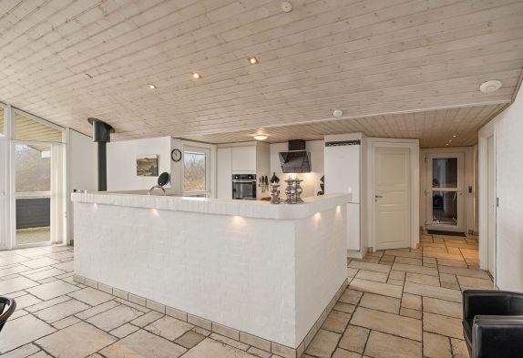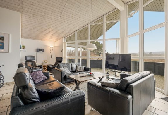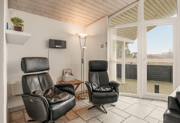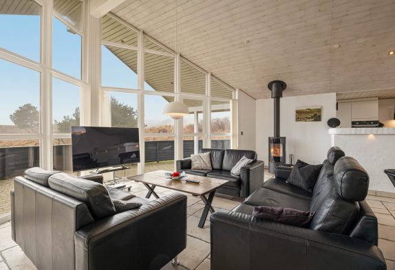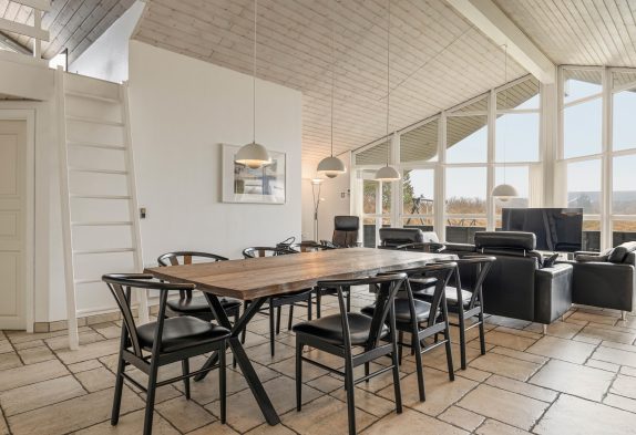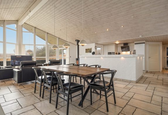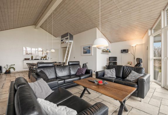 Køkkenet, der er stort, flot og moderne, indbyder til fælles madlavning. Efterfølgende kan der slappes af i de bekvemme møbler i stue-alrummet – hvor især de to lænestole er perfekte til at trække sig tilbage med den nyeste krimi eller avisen og lidt lækkert til ganen.