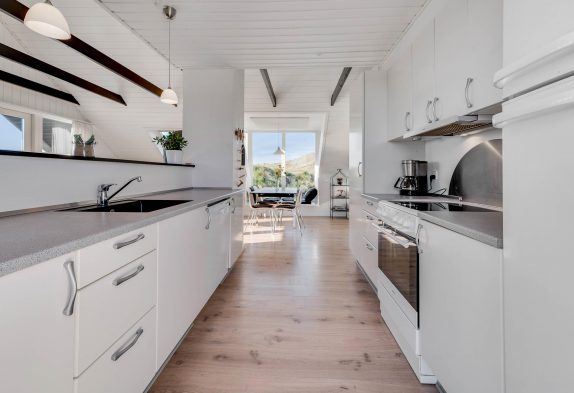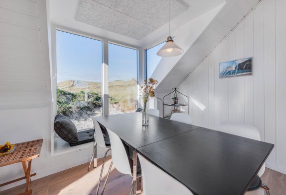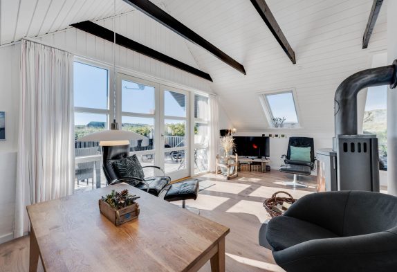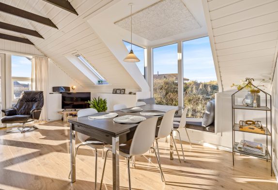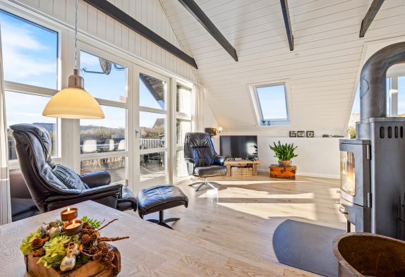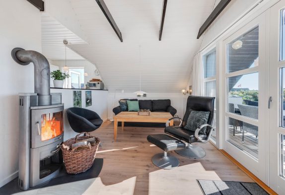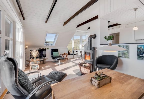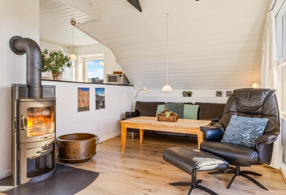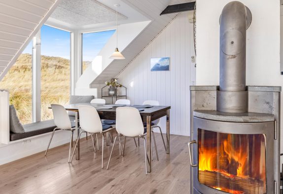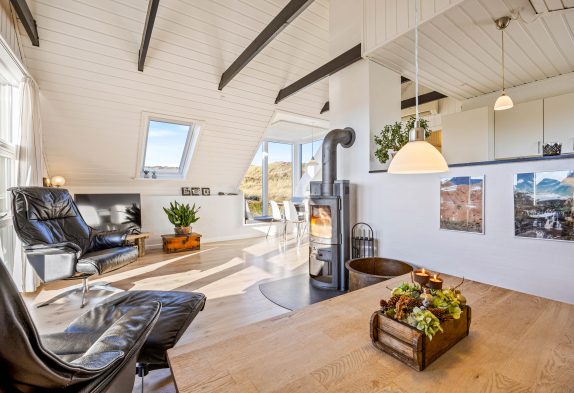 Sommerhusets store køkkenalrum er oplagt som feriens samlingspunkt. Her kan I hygge jer foran brændeovnen og nyde feriestemning og godt selskab. Efter en gåtur på den brede strand ved Vesterhavet, kan I varme jer i feriehusets sauna. Huset er desuden udstyret med en energibesparende varmepumpe.
