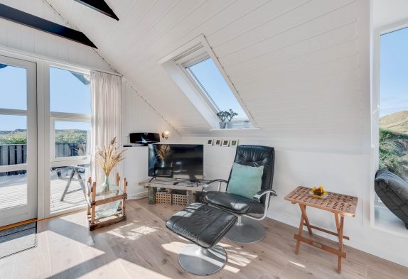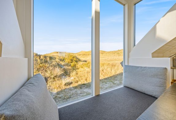 På den 3.334 kvadratmeter store naturgrund i Klegod er der udsigt til den vestjyske natur med de stejle klitter. Her kan I nyde naturen på sommerhusets store afskærmede terrasse, som sørger for fred og ro og giver jer mulighed for at holde øje med hunden.