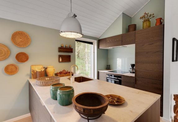Overalt er der åbent op til kip, hvilket giver en dejlig fornemmelse af plads i det skønne sommerhus. Nyd fællesskabet i husets hjerte, det store opholdsrum med den flotte og veludrustede køkkenafdeling i den ene ende med en åben forbindelse til den hyggelige stueafdeling.