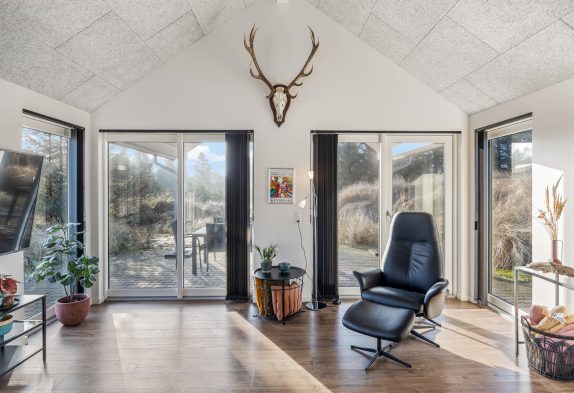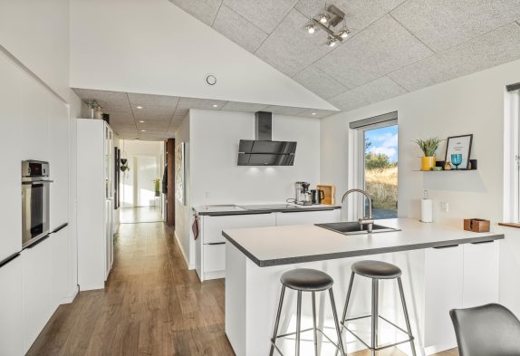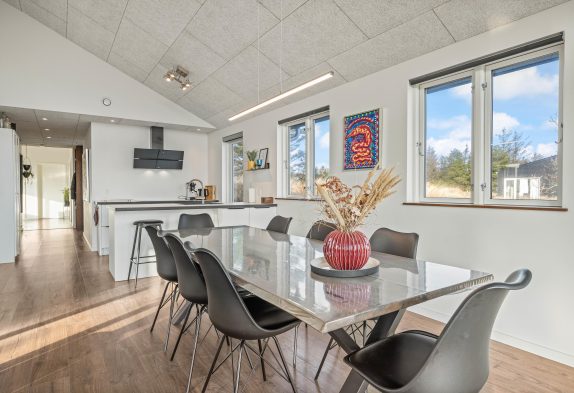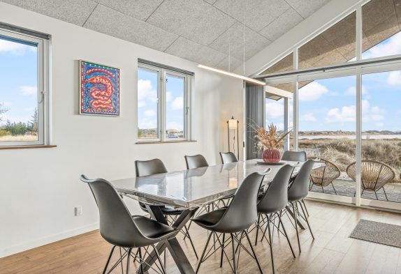 | På Lyngheden 1 i Grærup finder I dette moderne sommerhus fra 2019 med spa og aktivitetrum, der rummer plads til 8 personer. Ud over plads til familie og venner i sommerhuset, er hundene også velkomne. Sommerhuset har en naturskøn beliggenhed med udsigt over vand og Grærups flotte klitlandskab. Firestjernet sommerhus med spa, aktivitetsområde og plads til feriehyggeI sommerhuset finder I masser af plads med mulighed for at slappe af og komme væk fra hverdagens stress og jag. Sommerhuset rummer fire soveværelser, to badeværelser med gulvvarme, køkkenalrum og stue fordelt på 150 kvadratmeter. Sommerhuset er ideelt for jer, der ønsker tilbringe en masse tid sammen under ferien. Fra husets køkkenalrum er der åbent ind til stuen, der giver jer rig mulighed for samvær og mange hyggelige stunder sammen. Fra alrum og stue kan I nyde den skønne udsigt til søen og klitlandskabet. Ønsker I action på ferien, kan I udfordre hinanden i et spil airhockey eller bordfodbold i sommerhusets aktivitetsområde, hvor I vil kunne få mange timer til at gå sammen. Har man i stedet brug for en gang afslapning, er en tur i spabad tiltrækkende, hvilket er muligt i det ene af sommerhusets to badeværelser.   Stor terrasse med udsigt til vandetTil sommerhuset hører en stor terrasse. Fra terrassen har I også en fantastisk udsigt til søen og Grærups klitlandskab. Feriehusets terrasse er delvis overdækket. Det giver jer mulighed for at nyde en masse tid udendørs, uanset hvordan vejret arter sig under jeres ferie. Til terrassen hører også havemøbler, liggestole og grill, hvormed I kan få mest muligt ud af feriens solskinsdage og nyde dem i fulde drag.    Når dagen går på hæld, og solen så småt er ved at gå ned, kan I tænde op i ildstedet foran terrassen. Her vil I kunne nyde hinandens selskab og varmen fra bålet, mens I rister skumfiduser og snobrød. Rolige og naturskønne omgivelser tæt på VesterhavetSommerhuset er beliggende i Grærup, der er kendetegnet ved sin skønne og rolige natur. Mindre end 1 kilometer fra sommerhuset finder I det smukke Vesterhav, der helt klart er et besøg værd hele året rundt.   Ikke langt fra Grærup finder I den charmerende ferieby, Vejers Strand. Her er der både indkøbsmuligheder, spisesteder og butikker. |