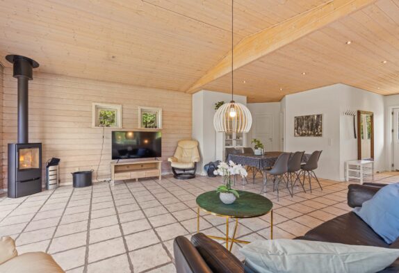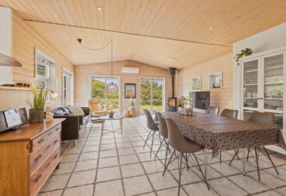 Både det åbne opholdsrum og badeværelset er udstyret med gulvvarme, så I ikke kommer til at fryse fødderne om morgenen, og en energivenlig varmepumpe holder omkostningerne og sikrer samtidig et behageligt rumklima hele året rundt. Når der skal skrues ekstra op for varmen og feriehyggen, kan I passende tænde op i brændeovnen, som altid er en garanti for god stemning.
