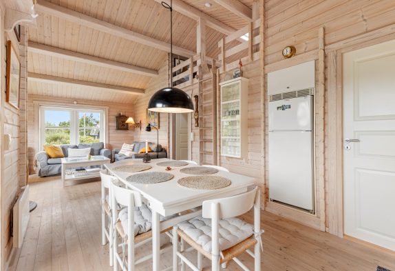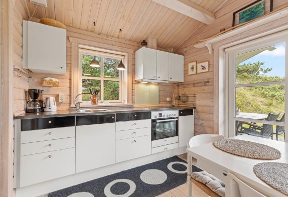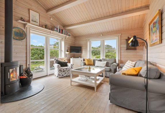 Stuen og køkkenet hænger sammen i ét stort fællesrum, og her vil I kunne nyde mange hyggelige stunder sammen. Sommerhusets brændeovn vil med sine knitrende flammer være med til at skabe en hyggelig stemning.