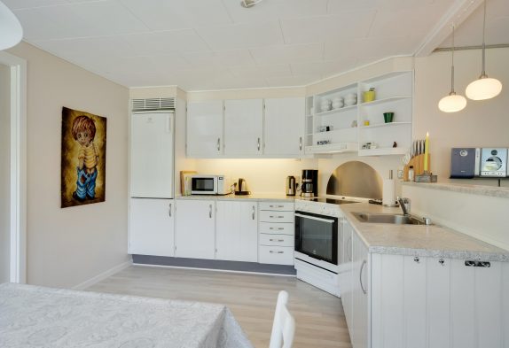 Sommerhuset har også et dejlig køkken/alrum med direkte udgang til den store træterrasse hvor der mulighed for, at I kan sidde uforstyrret og grille eller bare nyde solen i mens børnene leger i den store have hvor der er både gyngestativ og sandkasse.