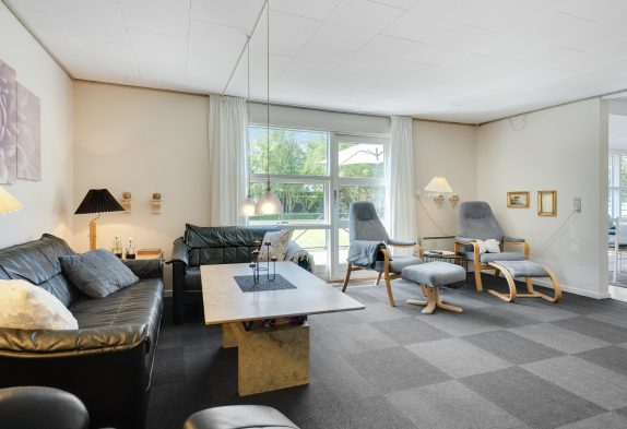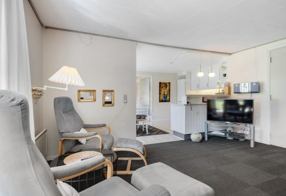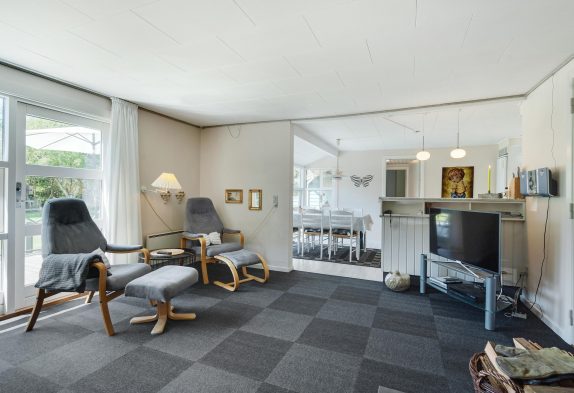 Feriehuset er med sine 3 soveværelser ideelt til en hyggelig familieferie og her rigeligt plads til 6 personer. Det dejlige sofahjørne indbyder til enten en hyggelig spilleaften i familien skød eller til ren afslapning foran brændeovn og TV. Fra det veludstyrede køkken er der udsyn til stuen, så man kan følge med i snakken, også imens der trylles i køkkenet.