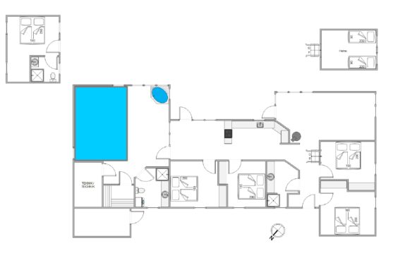 Feriehuset har plads op til 12 personer fordelt på 5 soveværelser og to ekstra opredninger på hemsen til familiens yngre generationer. Det ene soveværelse og et af husets 3 badeværelser befinder sig i annekset, der giver mulighed for at trække stikket og lade op til næste feriedags oplevelser. På badeværelset finder i også et pudslebord, som er en dejlig tilføjelse for forælderne.