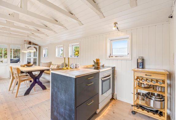 Det lille træhus på Bjerghuse 113 leder straks tankerne hen på den klassiske sommerhusferie. Sommerhuset har i 2020 gennemgået en delvis renovering, som har resulteret i et charmerende og velafstemt indre med fine detaljer og en indbydende atmosfære. Og praktiske detaljer som vaskemaskine og tørretumbler gør, at feriekufferten ikke behøver at være så tung.