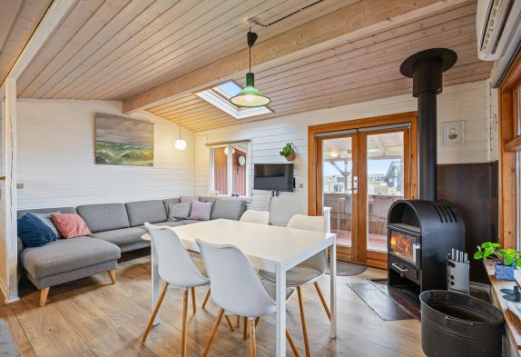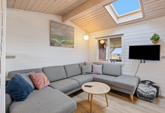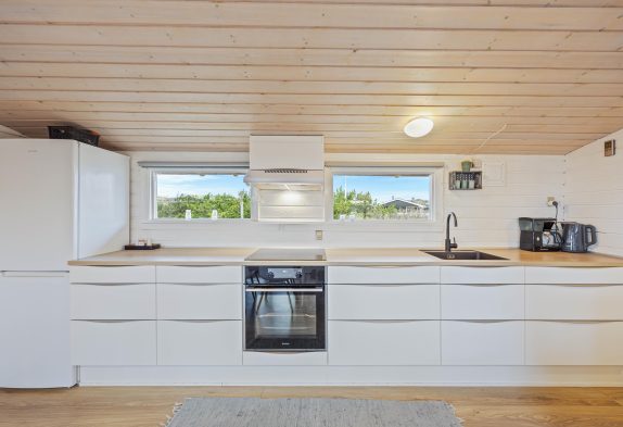 Sommerhuset fremstår lyst og hjemligt med bl.a. flotte og praktiske trægulve overalt. Ovenlysvinduer giver et fantastisk lys i sommerhuset – og når det er mørkt, kan I se stjernehimlen fra sofaen.
