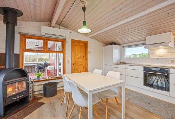 Det naturlige centrum i sommerhuset er opholdsrummet med både køkken, stue og spiseplads. Slap af i sofaen med en god bog og en kop varm kakao på en kølig efterårsdag, imens ilden knitrer lystigt i brændeovnen.