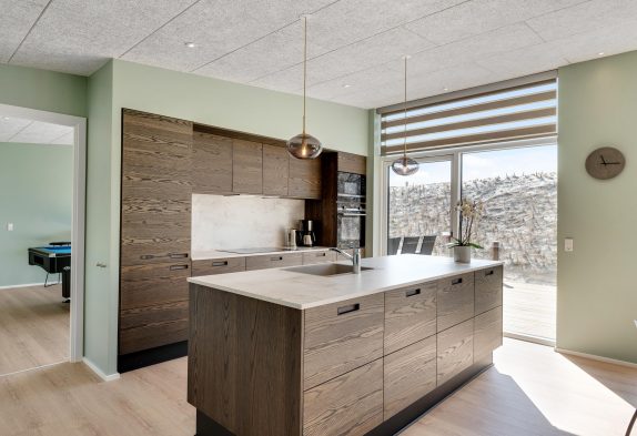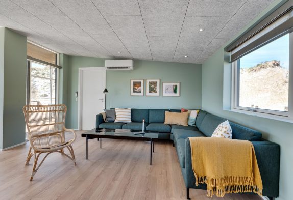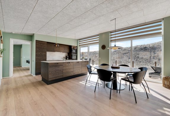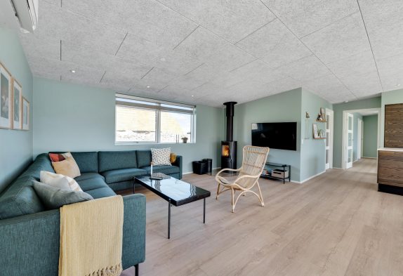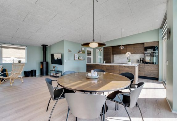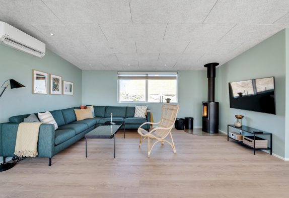 Køkken og stue er samlet i opholdsrummet – sommerhusets hjerte, hvor I kan samles til mange gode feriestunder med fælles madlavning, hyggelige spil og sjove film. I kan også tænde op i brændeovnen, der giver dét ekstra til feriestemningen. Fra opholdsrummet har I en god udsigt over byen og Ringkøbing Fjord.