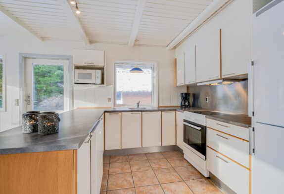Det veludstyrede køkken er i åben forbindelse til spisestuen, hvor der også er en dør direkte ud til den store sydvendte terrasse. Her er rig mulighed for at alle kan hjælpe til med dages måltider, om det er på grill eller komfur de tilberedes. Sandkasse og gynger står klar på den store grund, som ligger rundt om sommerhuset. Her er der god mulighed for leg både for børn, voksne og hund, – der er nemlig op til 2 hunde tilladt i huset.