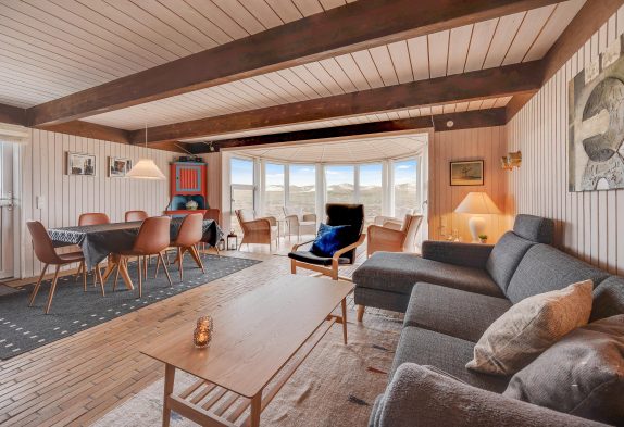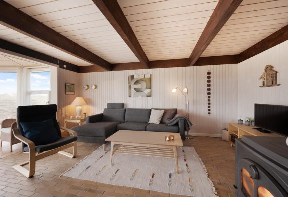 Midt i rummet står brændeovnen, som er med til at give en dejlig jævn varme i hele rummet. Afslapning i sofaen med en kop kaffe og en god bog foran den knitrende varme ild og med naturen ”strømmende ind” igennem panoramavinduerne i udestuen er rent velvære.