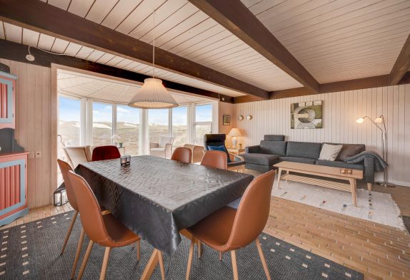 Hyggelig og lys indretning med udestue og udsigt til naturen