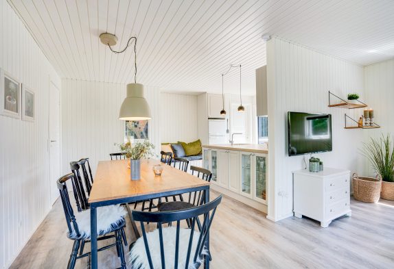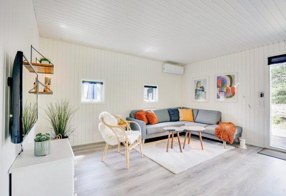 Det klassiske træsommerhus byder på skønne detaljer både inde og ude. Rummene er hyggeligt indrettet med lyse farver og der er tænkt på komforten fx med en lækker hjørnesofa og en lænestol med læselys ved brændeovnen – det perfekte sted en et par times afslapning med en god bog eller en varm kop te.