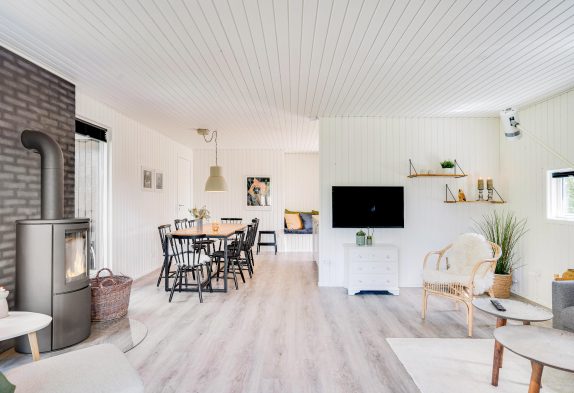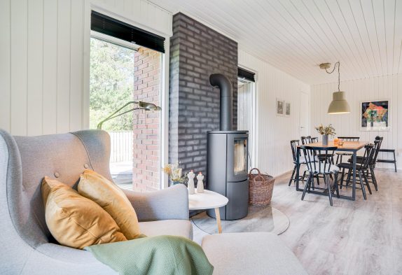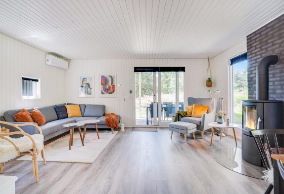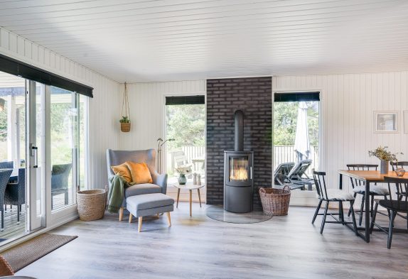 Lys og venlig indretning med brændeovn som prikken over i’et