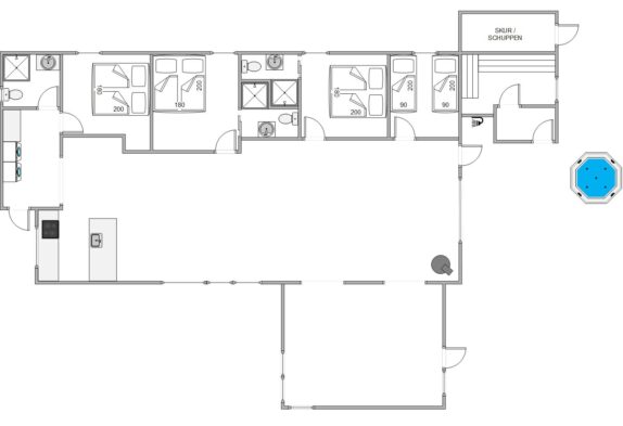 I sommerhuset på Bjerregårdsvej 381 vil I med garanti komme til at holde en skøn og afslappende ferie sammen. Sommerhuset har 4 soveværelser, 3 badeværelser og et stort opholdsrum, hvor køkken, stue og spisestue er forenet – det oplagte sted at samles til hygge, sjov og planlægning af feriedagene. Skal der skrues ekstra op for feriestemningen, kan I tænde op i brændeovnen og hygge jer med billard, mens mørket falder på.